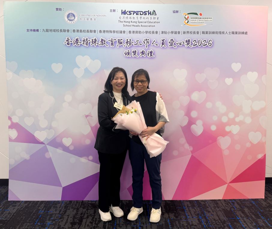 香港特殊教育服務工作人員愛心獎2026本校吳少華書記榮獲由「香港特殊教育學校校長聯會」主辦之「香港特殊教育服務工作人員愛心獎」2026。此獎項旨在表揚特殊教育服務人員以專業精神與真摯愛心服務學生的貢獻,肯定吳書記多年來在支持有特殊教育需要學生方面的努力與付出。